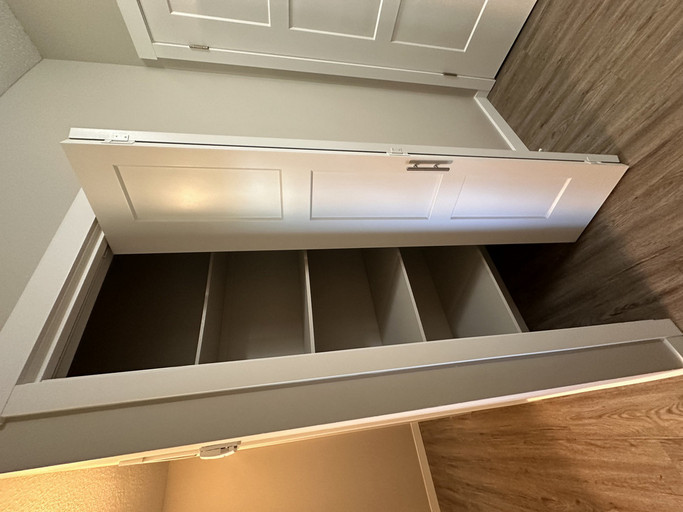 - Modern Kitchen Cabinetry with extra high shelving for more storage